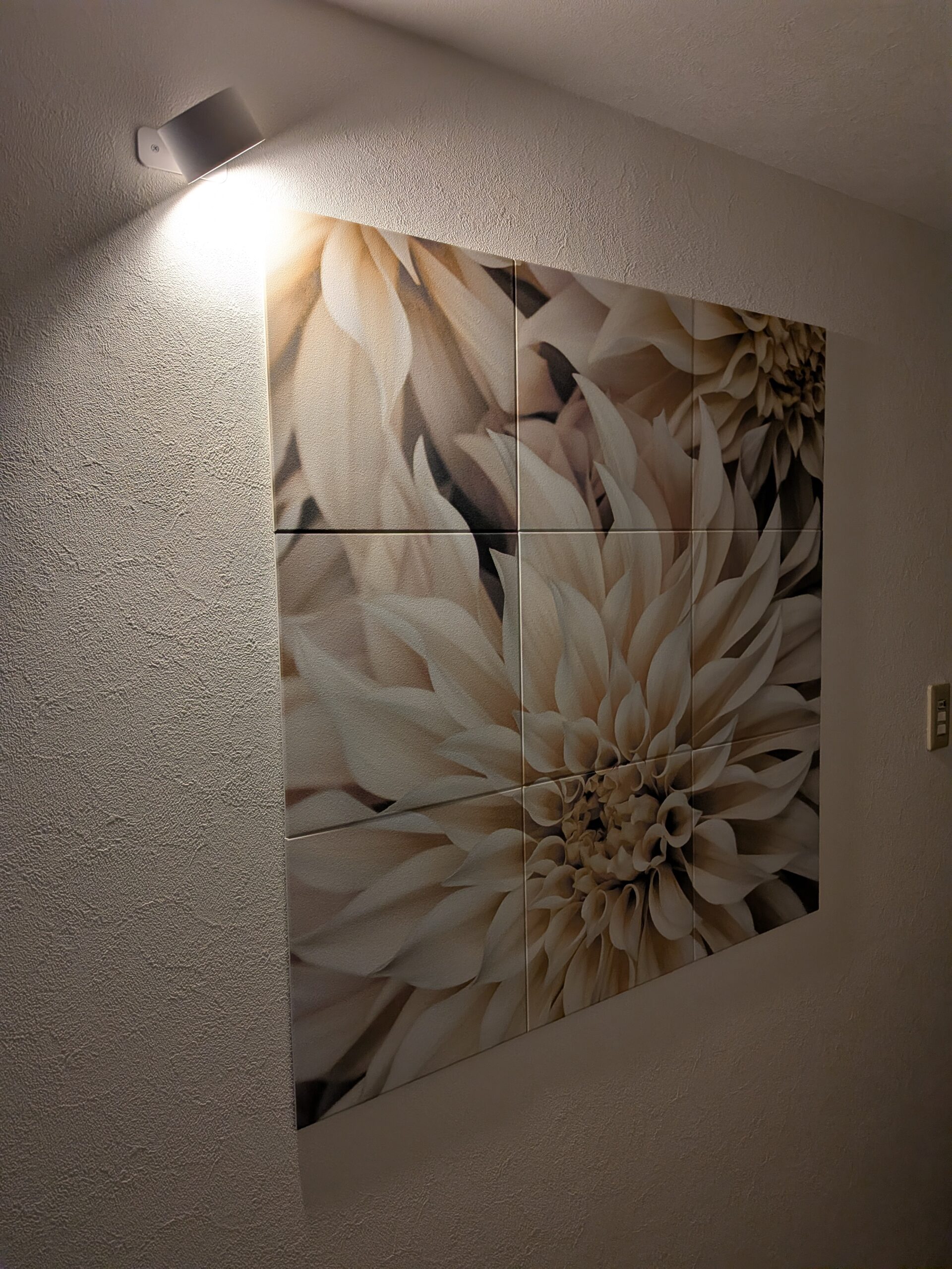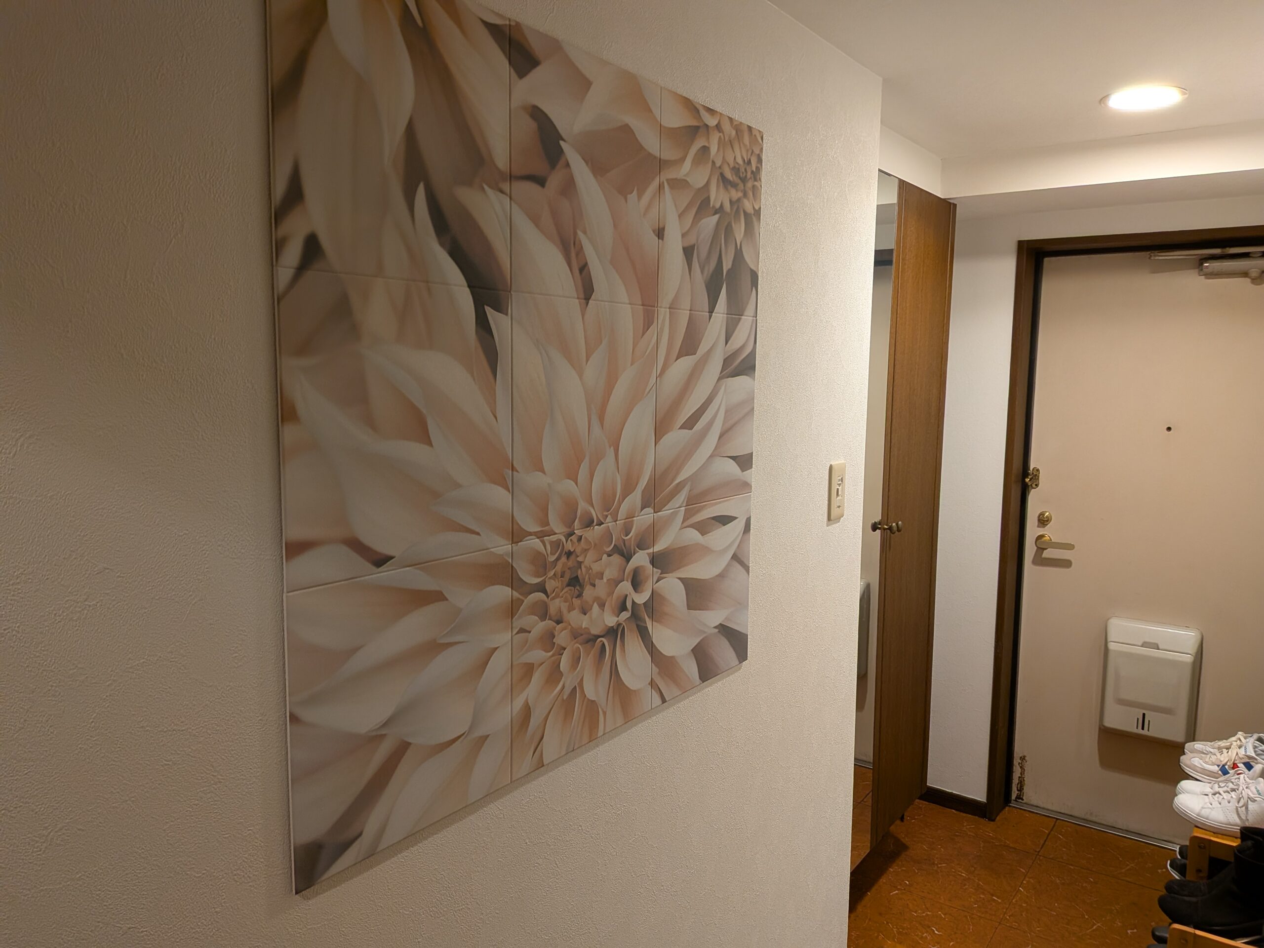 「エコカラットセルフ」を導入した弊社社員のOさん。リビングの次は玄関の廊下にも設置しました。シンプルだった玄関が一気に華やぎました。間接照明を付けて、更にリッチな雰囲気に。気になる玄関のにおい対策もばっちりです。